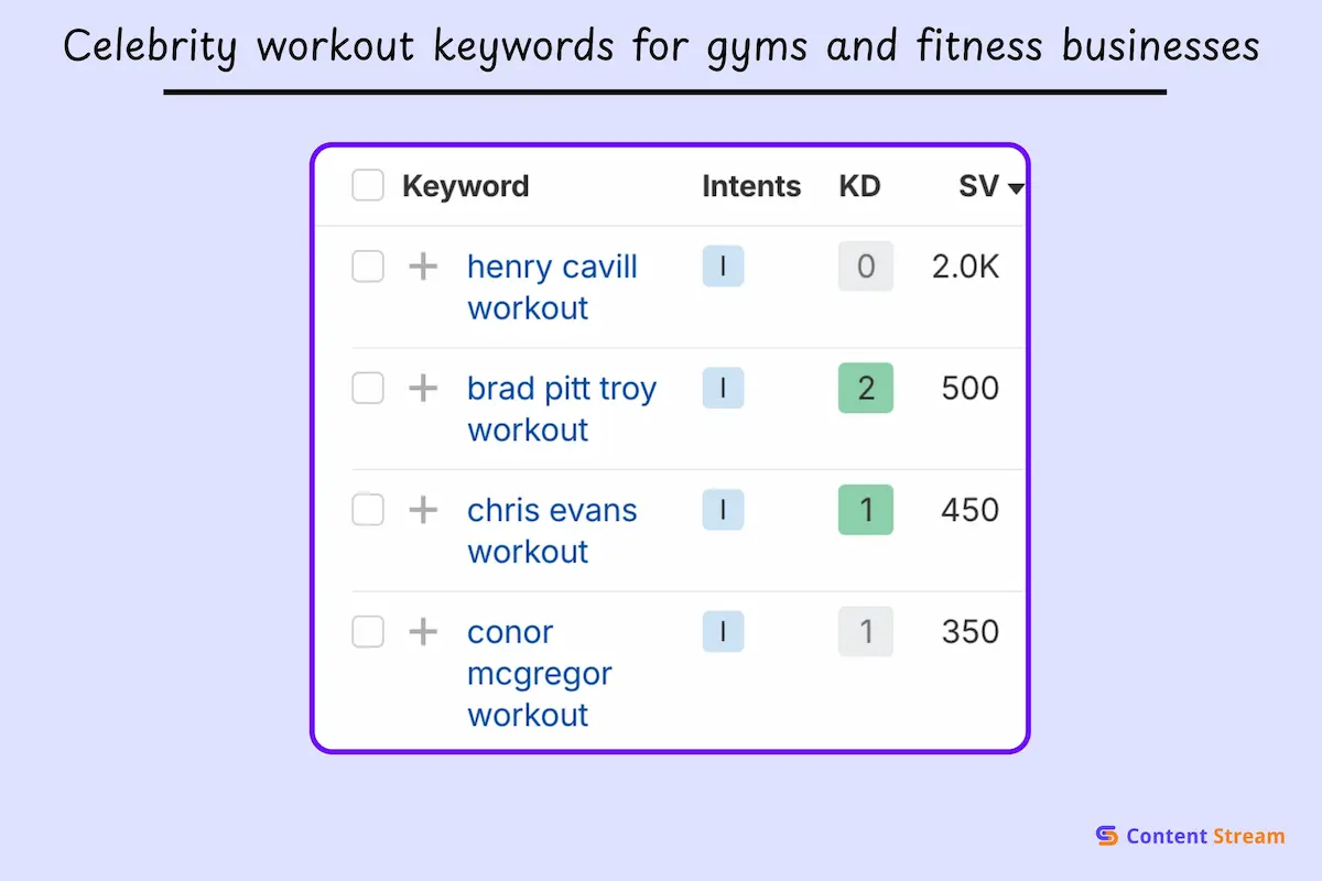 • We included celebrity workout keywords. These drive significant traffic and help build brand authority, even if they don’t directly convert to gym memberships.