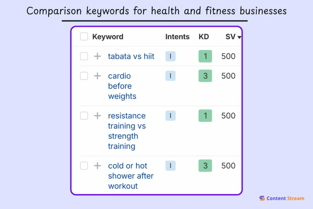 Keyword examples: resistance training vs strength training, tabata vs hiit, cardio before weights, cold or hot shower after workout