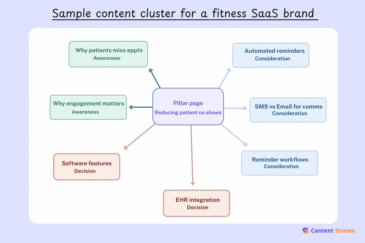 Most strong SaaS topic clusters include content for awareness, consideration, and decision. That matters because buyers usually start with questions, problems, comparisons, and internal research, not product pages.