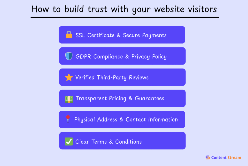Trust is built when a brand is transparent about limits, risks, and trade-offs. Google’s quality raters look for trust signals beyond content. They look out for HTTPS security, clear contact information, transparent privacy policies, and accessible terms of service.