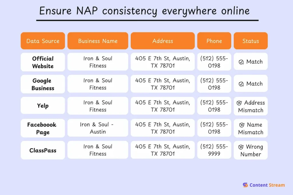 Think of it like this. Your Google Business Profile says “123 Main Street.” Your Yelp listing says “123 Main St.” Your Facebook page still shows your old address from before you moved.
