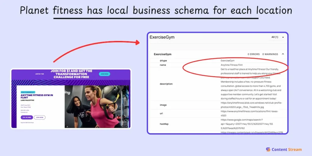 For gym chains and multi-location studios, your GBP setup also needs structure. Each location should have its own profile. Ideally, you also want them to have their own page on your website, and use local schema to show they are local separate entities. LIke the example below of Anytime Fitness.