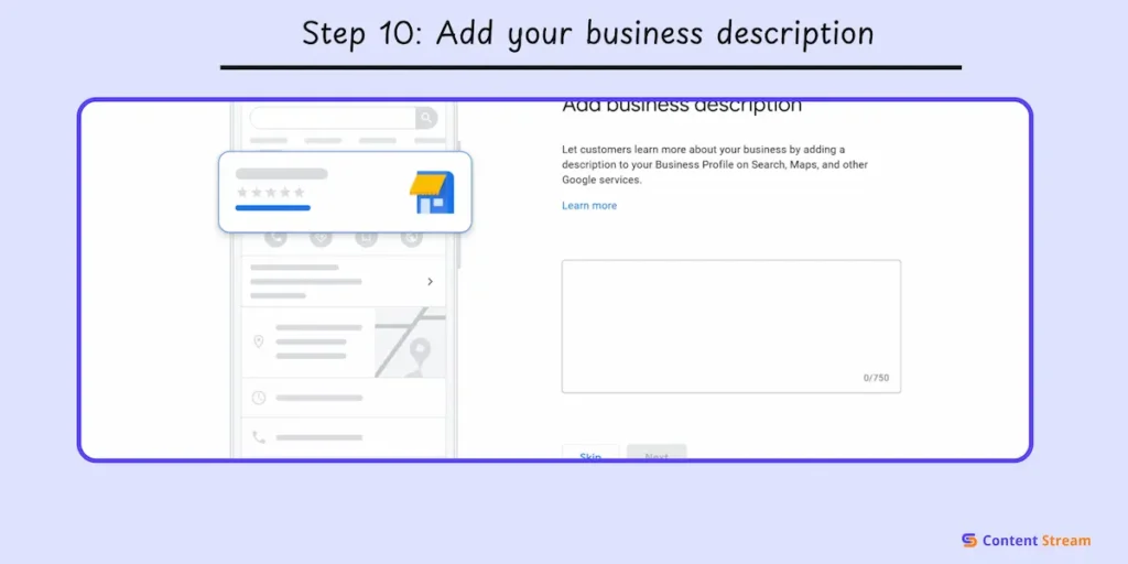 This is where you tell Google and potential members what your business does. You get 750 characters, so every sentence counts. Only the first 250 characters will appear in search results, so add the most important information first.