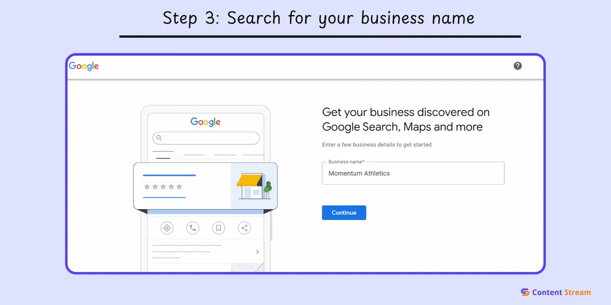 Type in your exact business name as it appears legally or as you want it to show up on Google. For this guide, we’re creating a new profile called Momentum Athletics. It won’t go live, as it goes against Google’s Business Profile guidelines. This is simply to show what the steps look like.