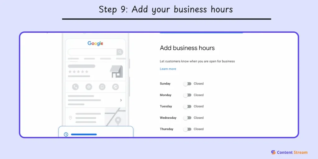 The business hours you set trigger the “Open now” indicator in search results so you want to be as accurate as possible.