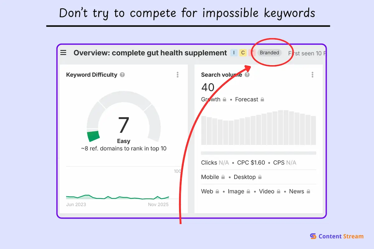 If you’re targeting “muscle growth supplement” (a high difficulty keyword), you’re up against websites with millions of visitors, hundreds of backlinks, and content teams working full-time. You could write the best article ever and still never crack the first page.