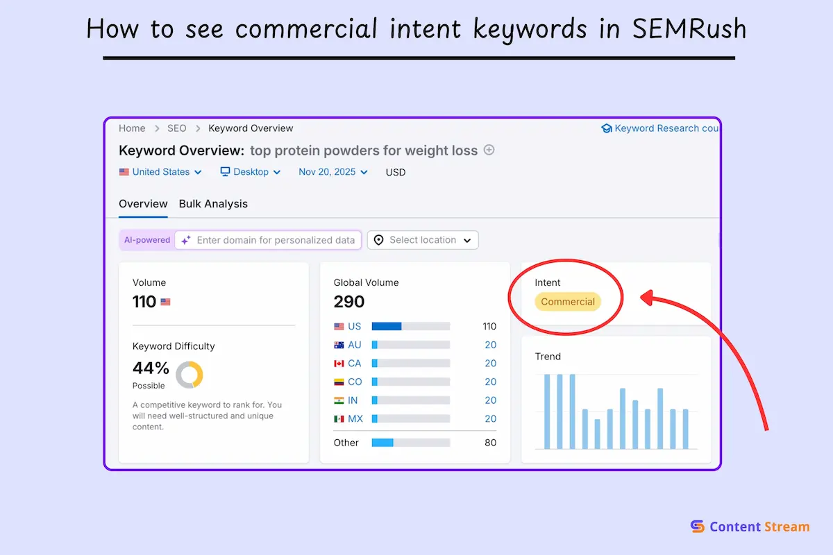 With SEMRush, you’ll see it under the “Intent” section.