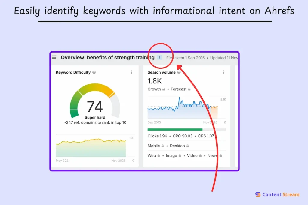 In tools like ahrefs, you’ll see the search intent highlighted above the summary, like in the screenshot above.