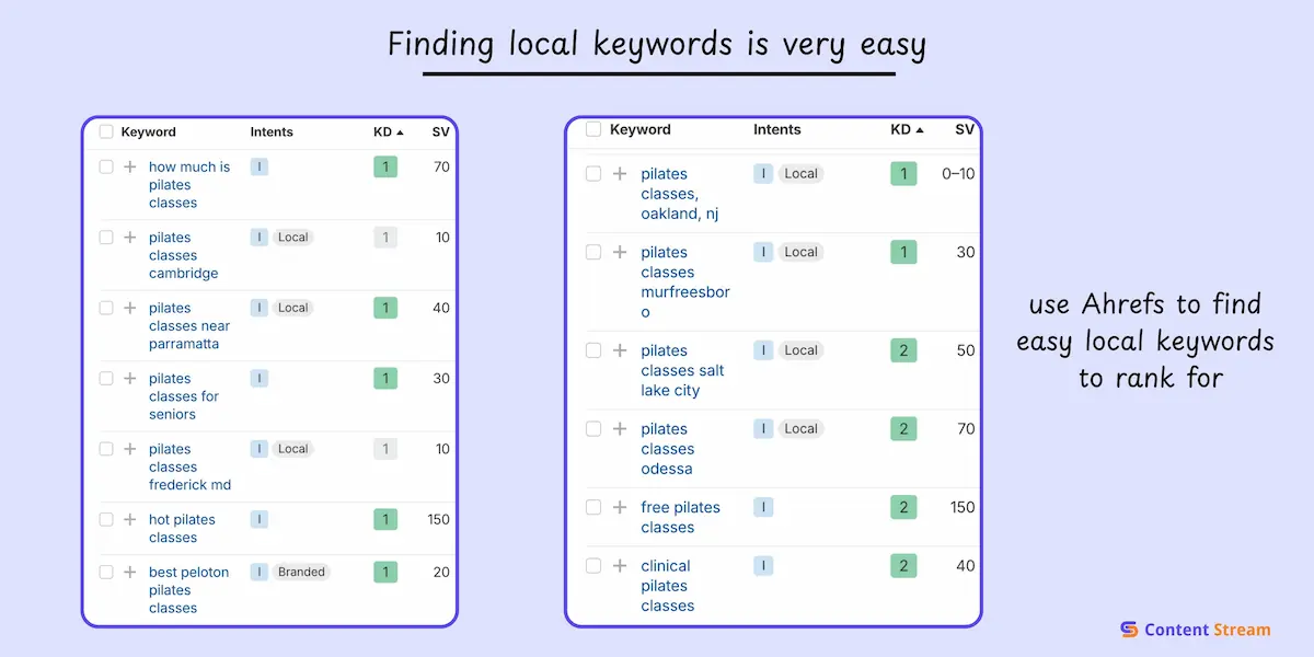 Local keywords almost always have lower difficulty because the competition pool is smaller. Plus, these searches have high intent. Someone searching “gym near me” or “Pilates downtown Seattle” is looking to book a Pilates class right now.