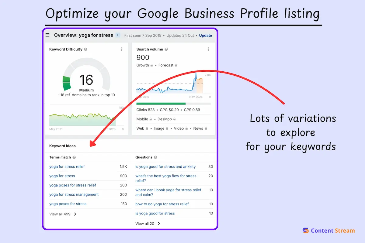 Let’s say one of your seed keywords is “yoga for stress.” Type that into your tool and it’ll show you dozens of variations people actually search for: “yoga for stress relief,” “yoga poses for anxiety,” “can yoga help with stress,” and so on.