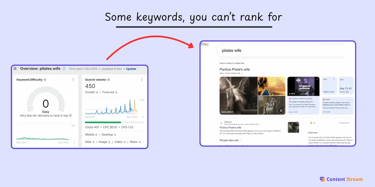 But one look at the SERP and it becomes obvious the query is actually about the wife of Pontius Pilate, the Roman Official.