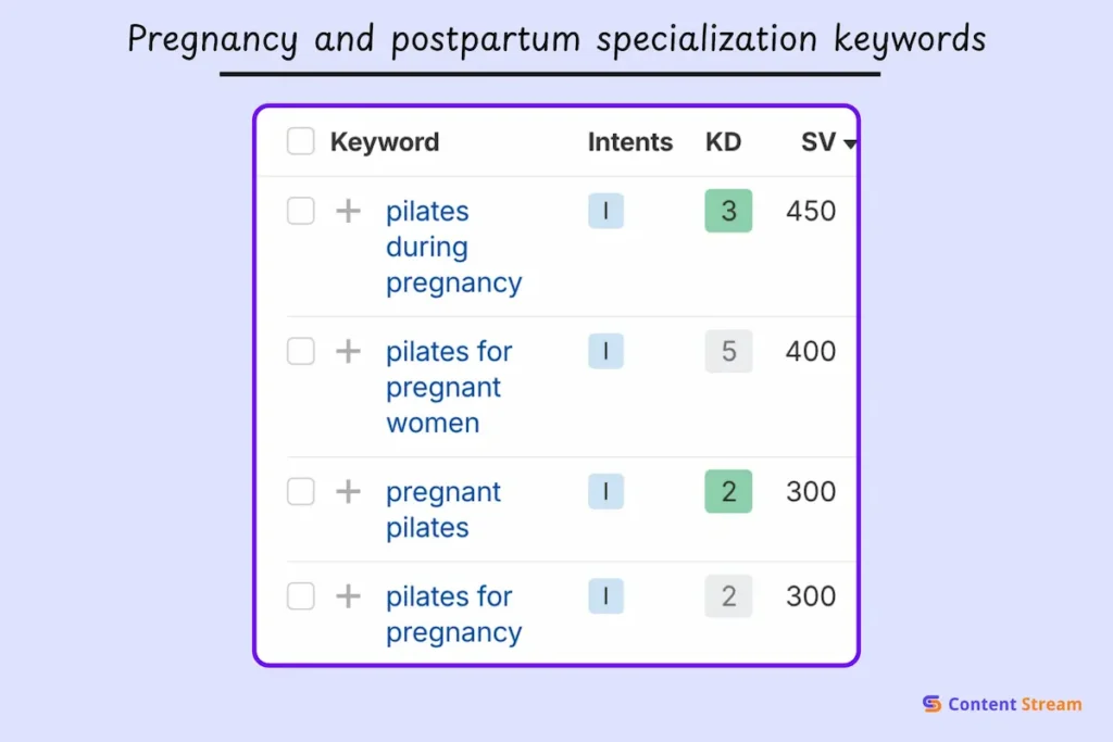 Focusing on these keywords can create opportunities for your Pilates studio because searchers are looking for specialized instructions, and there’s a potential to acquire long-term clients who will continue with postnatal classes and regular practice after giving birth.