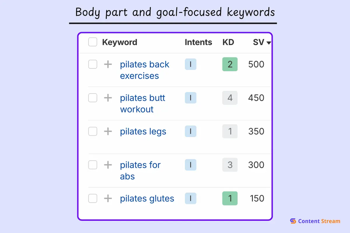 Below you’ll find our complete list of low-difficulty Pilates keywords, plus detailed strategies for understanding how Pilates searchers behave differently than other fitness audiences.